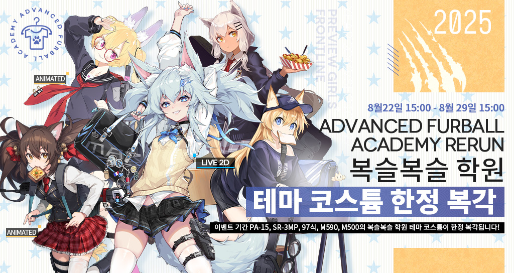 안녕하세요, 지휘관 여러분! 8월 22일 15:00 ~ 8월 29일 15:00 기간, “복슬복슬 학원” 테마 코스튬이 한정 복각됩니다!