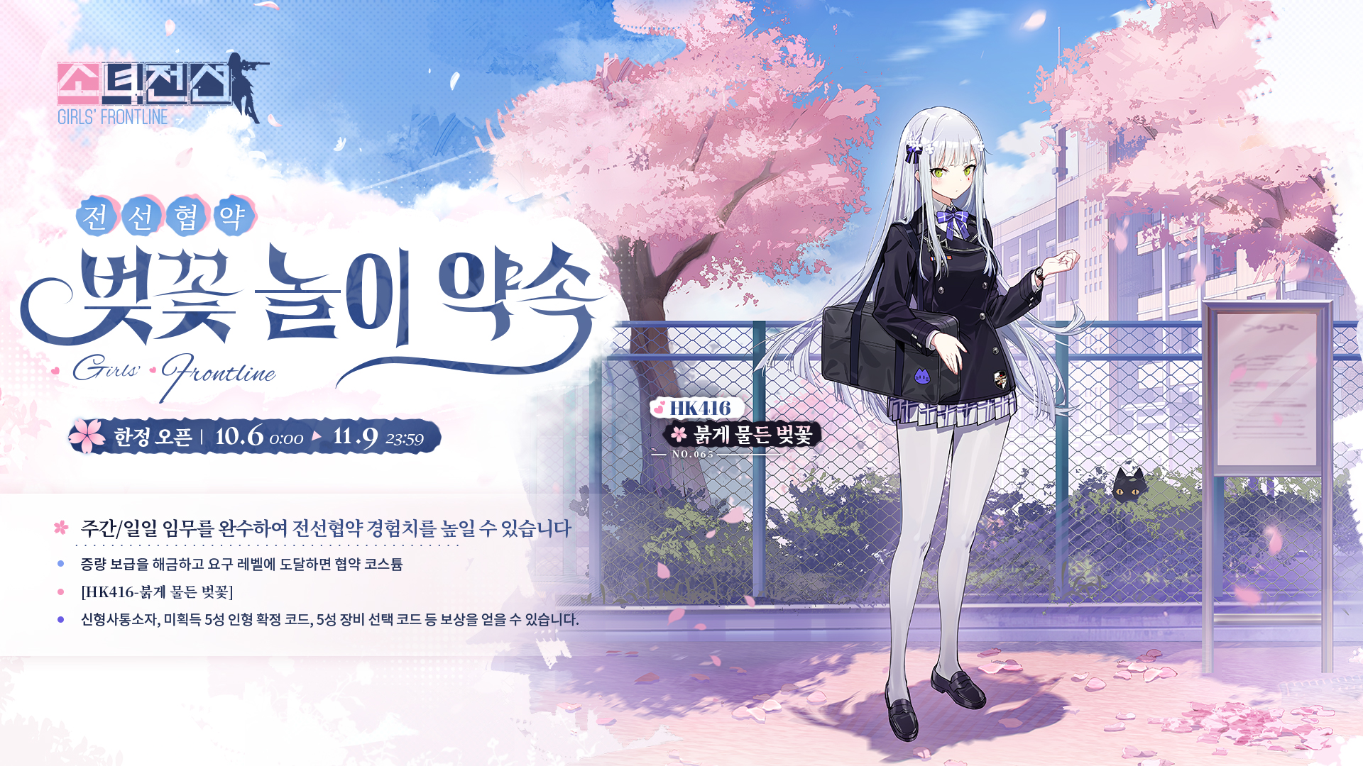 안녕하세요, 지휘관 여러분! 제33차 전선협약 “벚꽃 놀이 약속”이 10월 6일 00:00 ~ 11월 9일 23:59 기간 진행됩니다! 일일/주간 임무를 달성해 협약 레벨을 올려, 증량보급을 해금하면 “HK416-붉게 물든 벚꽃” 코스튬을 포함한 푸짐한 보상을 얻을 수 있습니다!