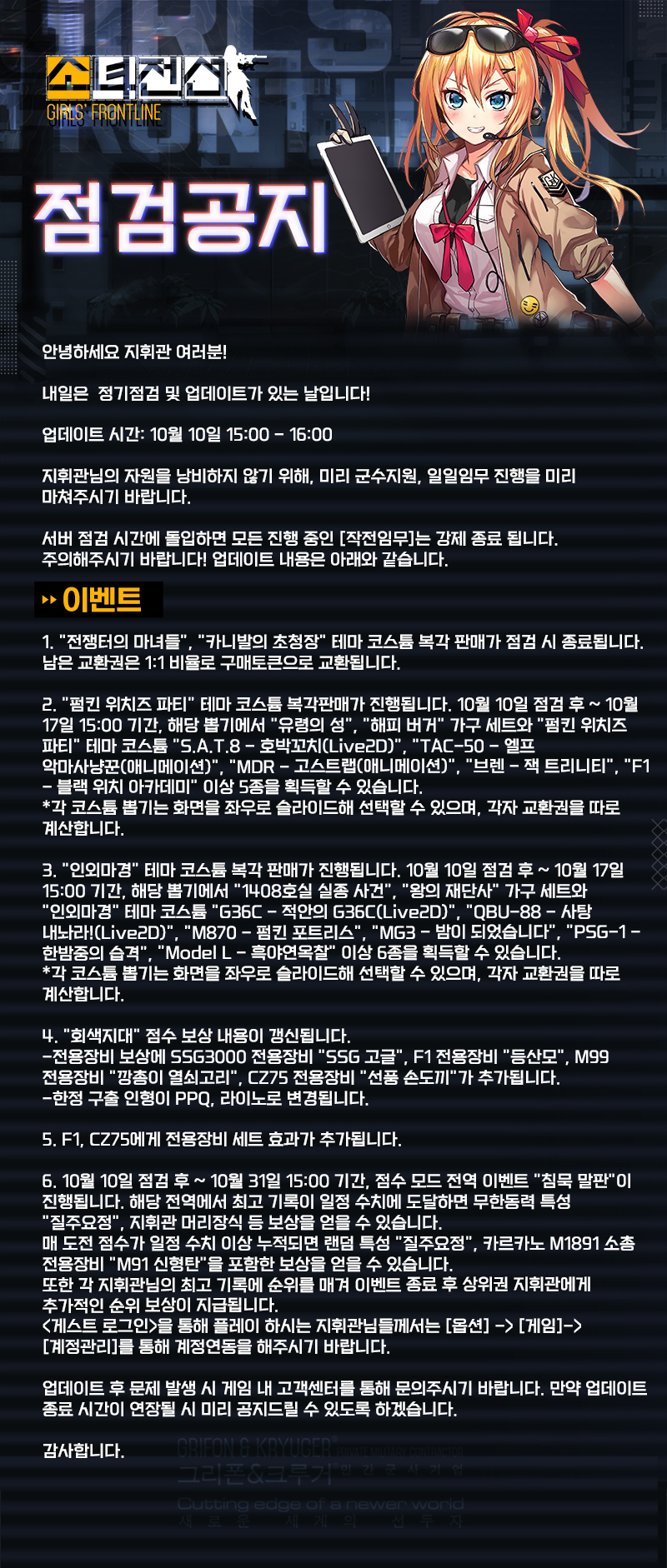 10월 10일 점검 및 업데이트 예고 – 소녀전선