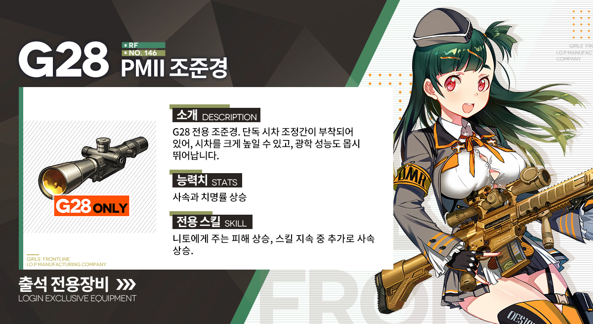 안녕하세요, 지휘관 여러분! 2025년 11월 출석 보상으로 얻을 수 있는 G28의 전용장비 “PMII 조준경”을 소개해 드립니다! 착용 시 사속과 치명률이 상승하고, 니토에게 주는 피해가 대폭 상승하며, 스킬 지속 중에 사속이 더욱 오른답니다!