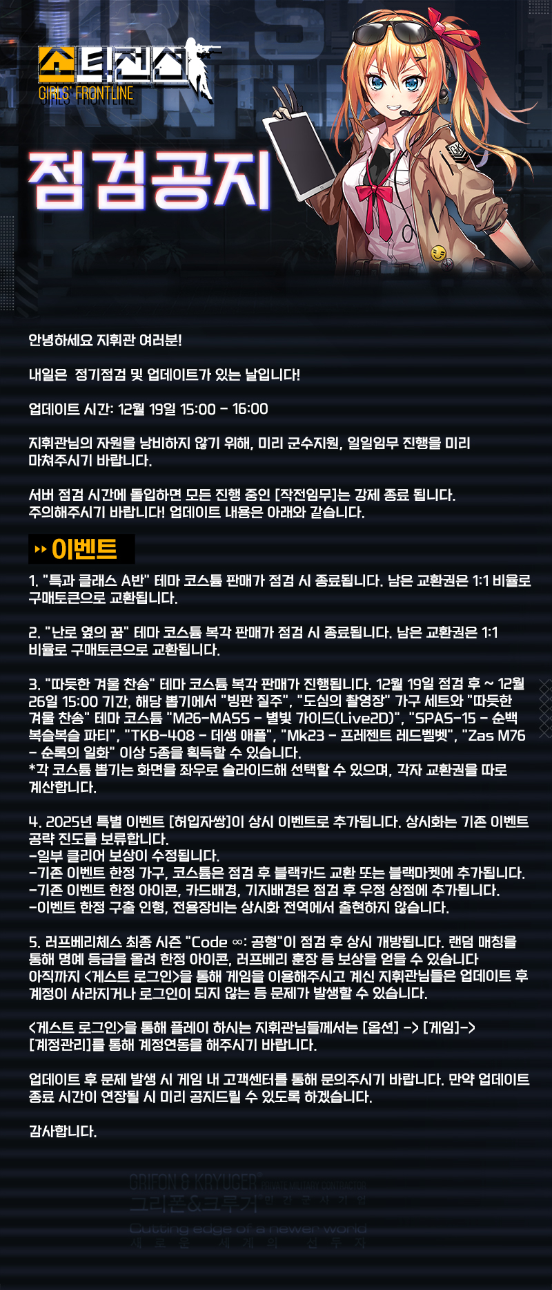 12월 19일 점검 및 업데이트 예고 – 소녀전선