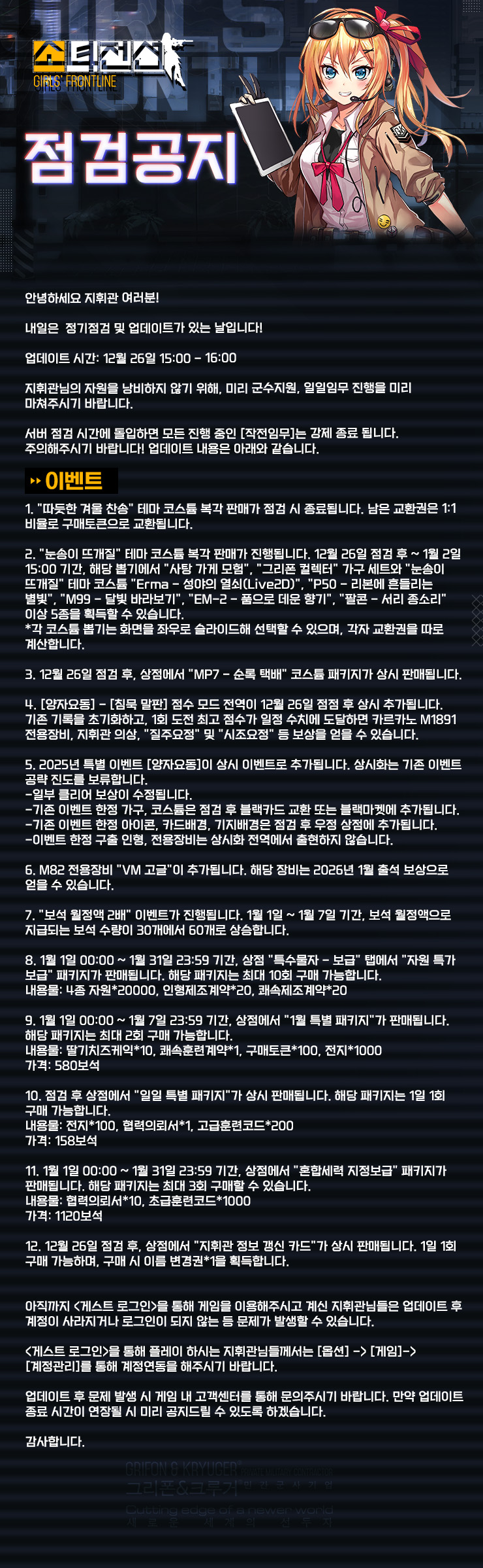 12월 26일 점검 및 업데이트 예고 – 소녀전선