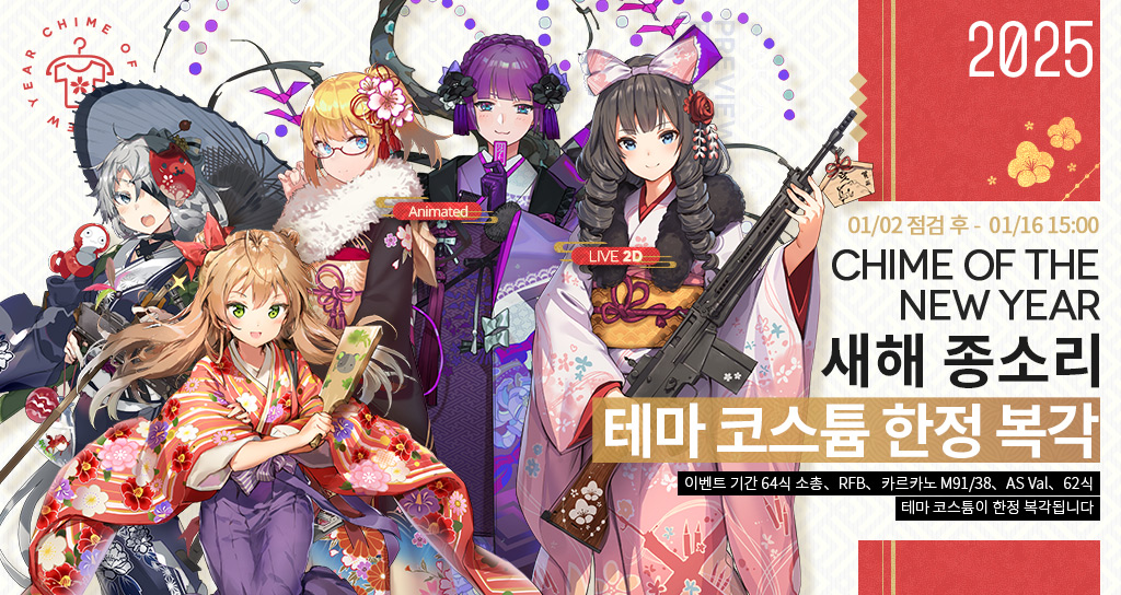 안녕하세요, 지휘관 여러분! 1월 2일 업데이트 후 ~ 1월 16일 15:00 기간, “새해 종소리” 테마 코스튬이 한정 복각됩니다! 복각 기간 해당 뽑기에서 “근하신년의 신사”, “따스한 일본의 겨울” 가구 세트와 “새해 종소리” 테마 코스튬 5종을 획득할 수 있습니다. *각 코스튬 뽑기는 화면을 좌우로 슬라이드해 선택할 수 있으며, 각자 교환권을 따로 계산합니다.