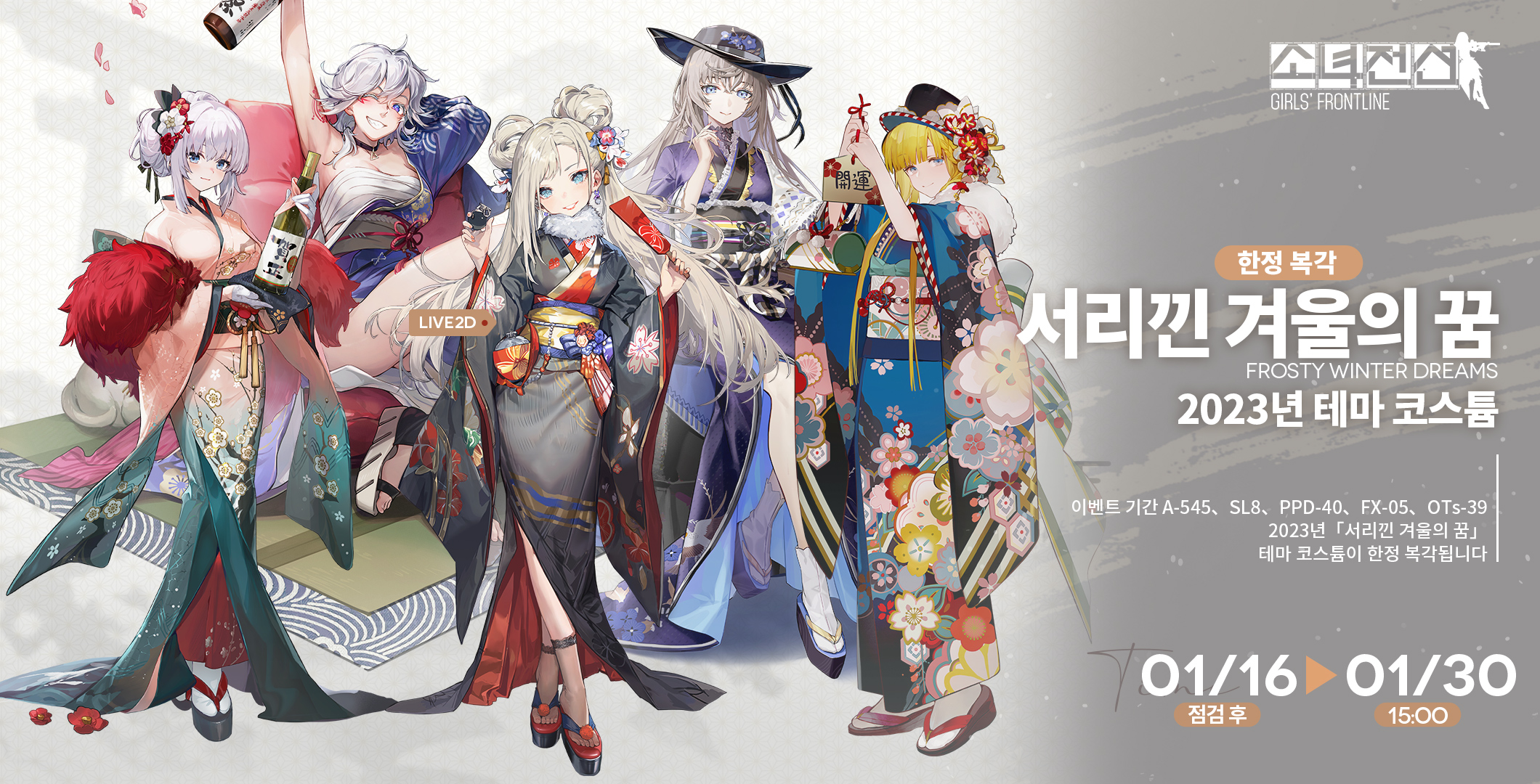 안녕하세요, 지휘관 여러분! 1월 16일 점검 후 ~ 1월 30일 15:00 기간,, “서리낀 겨울의 꿈” 테마 코스튬이 한정 복각됩니다! *각 코스튬 뽑기는 화면을 좌우로 슬라이드해 선택할 수 있으며, 각자 교환권을 따로 계산합니다.