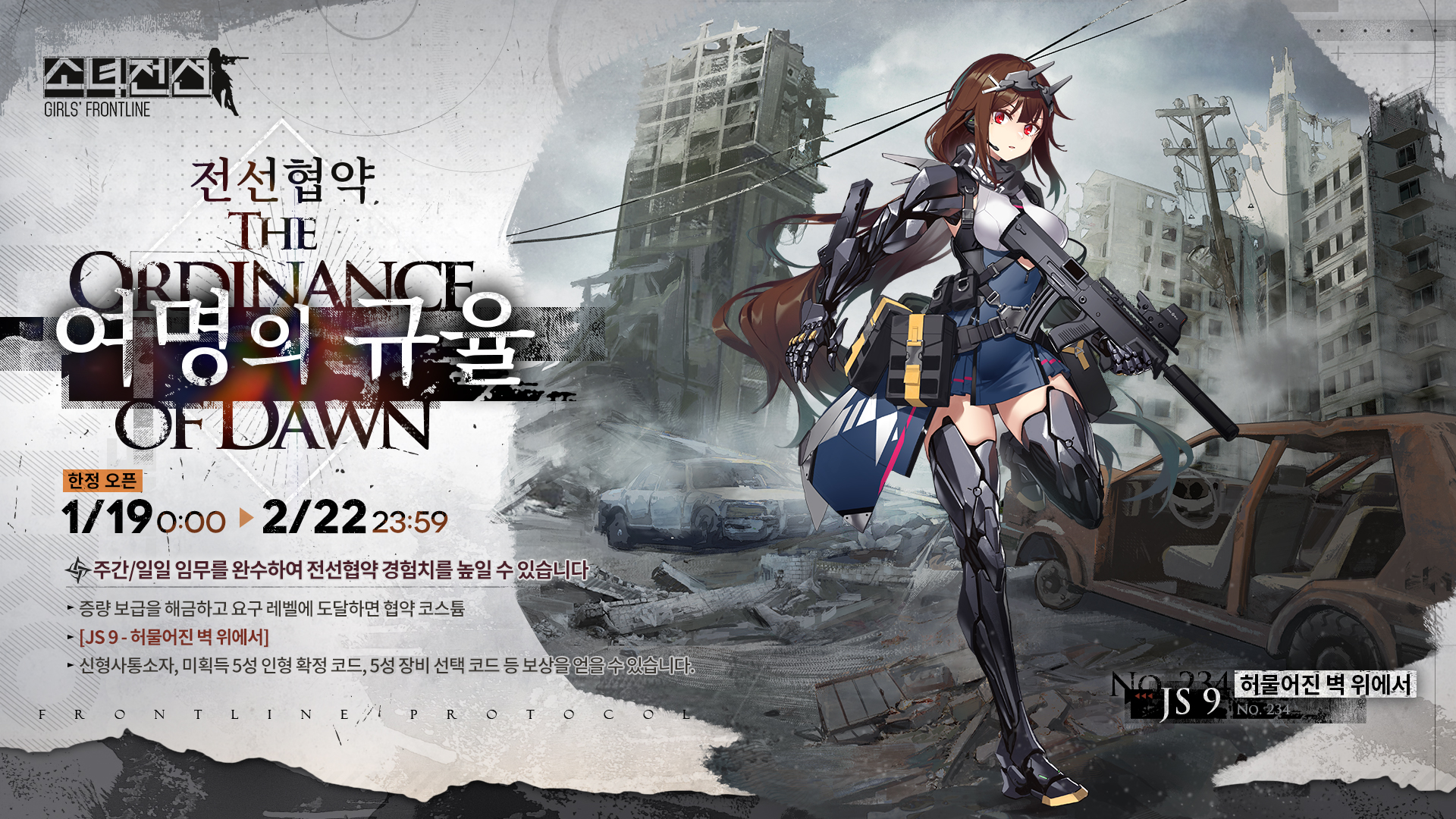 안녕하세요, 지휘관 여러분! 제36차 전선협약 “여명의 규율”이 1월 19일 00:00 ~ 2월 22일 23:59 기간 진행됩니다! 일일/주간 임무를 달성해 협약 레벨을 올려, 증량보급을 해금하면 “JS 9 – 허물어진 벽 위에서” 코스튬을 포함한 푸짐한 보상을 얻을 수 있습니다!