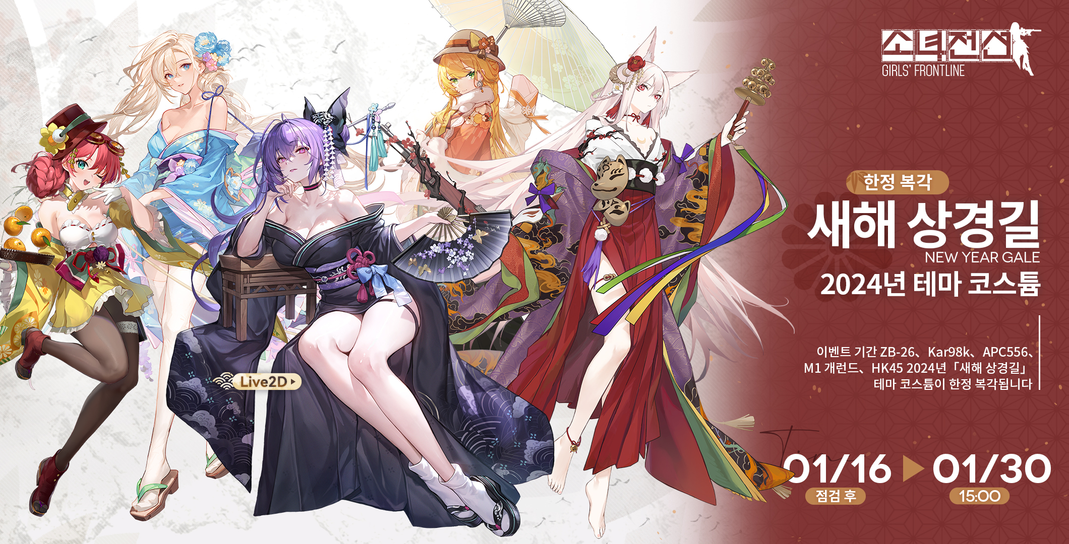 안녕하세요, 지휘관 여러분! 1월 16일 점검 후 ~ 1월 30일 15:00 기간, “새해 상경길” 테마 코스튬이 한정 복각됩니다! *각 코스튬 뽑기는 화면을 좌우로 슬라이드해 선택할 수 있으며, 각자 교환권을 따로 계산합니다.