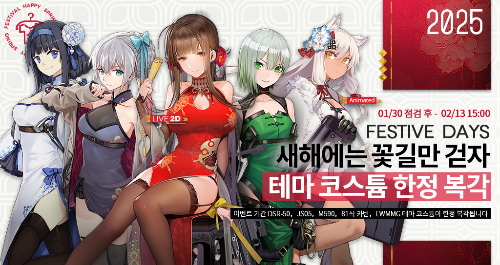 안녕하세요, 지휘관 여러분! 1월 30일 점검 후 ~ 2월 13일 15:00 기간, “새해에는 꽃길만 걷자” 테마 코스튬이 한정 복각됩니다! 복각 기간 해당 뽑기에서 “차이나타운의 설”, “사이클 다이어리” 가구 세트와 “새해에는 꽃길만 걷자” 테마 코스튬 5종을 획득할 수 있습니다. *각 코스튬 뽑기는 화면을 좌우로 슬라이드해 선택할 수 있으며, 각자 교환권을 따로 계산합니다.