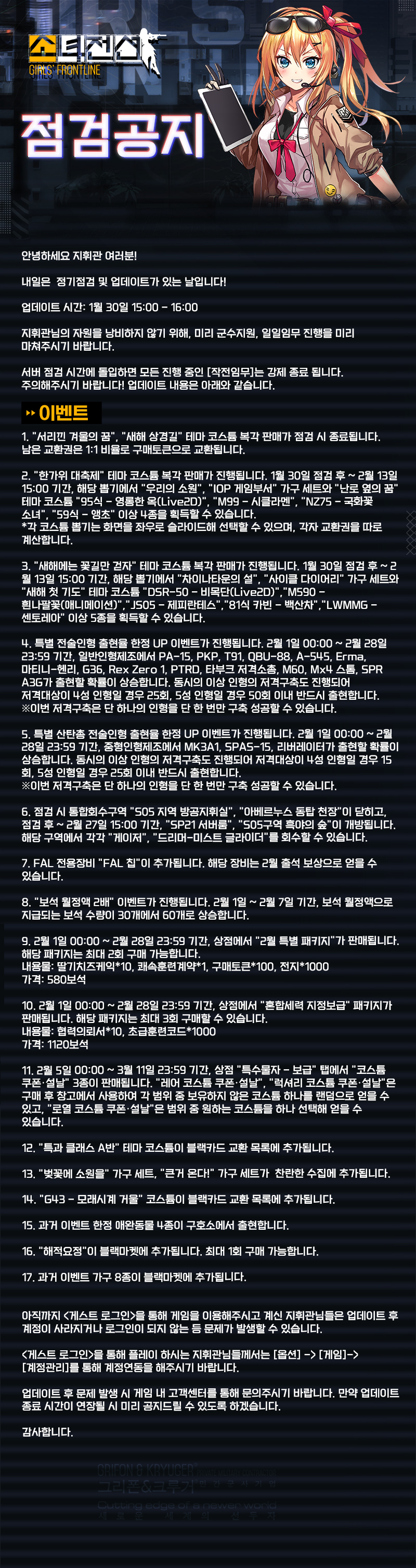 1월 30일 점검 및 업데이트 예고 – 소녀전선