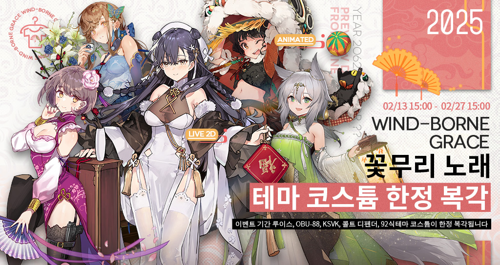 안녕하세요, 지휘관 여러분! 2월 13일 점검 후 ~ 2월 27일 15:00 기간, “꽃무리 노래” 테마 코스튬이 한정 복각됩니다! 복각 기간 해당 뽑기에서 “설맞이 시장”, “가을” 가구 세트와 “꽃무리 노래” 테마 코스튬 5종을 획득할 수 있습니다. *각 코스튬 뽑기는 화면을 좌우로 슬라이드해 선택할 수 있으며, 각자 교환권을 따로 계산합니다.