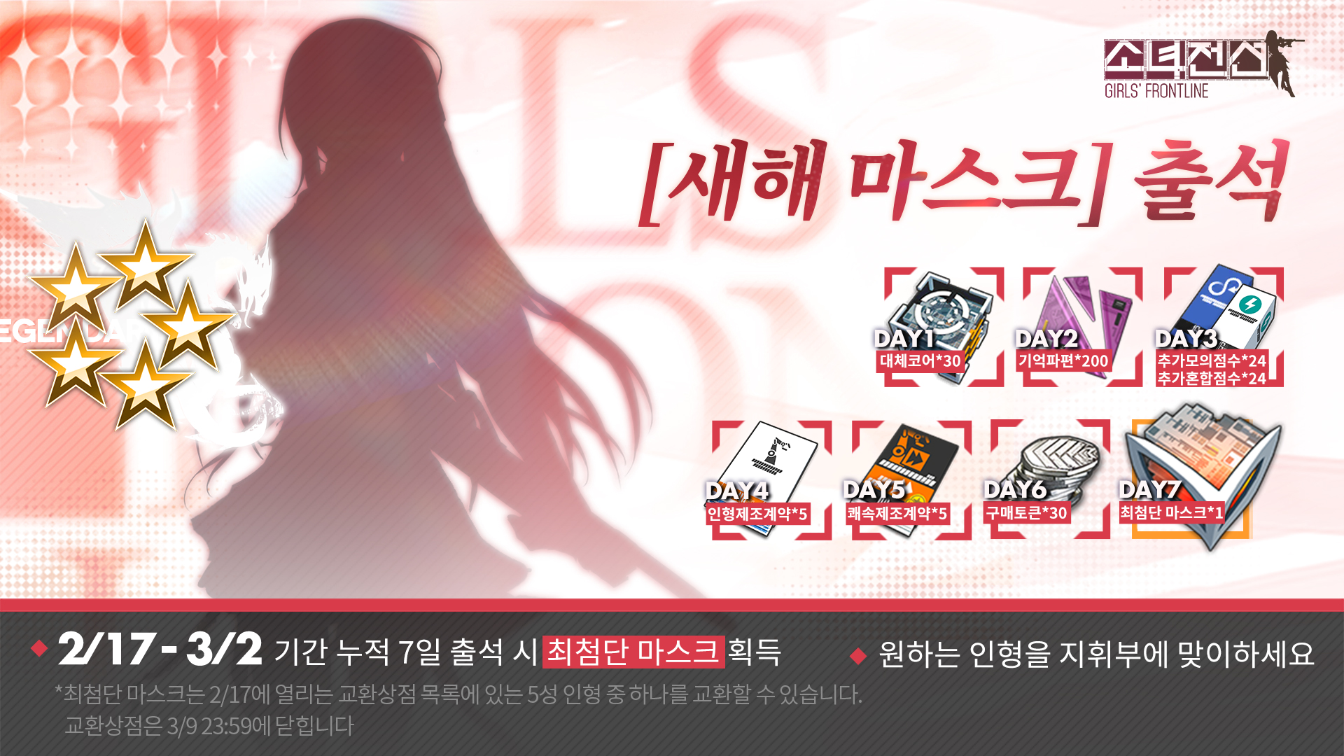 ※최첨단 마스크는 2월 17일 23:59까지 이벤트 상점에서 목록 중 원하는 5성 인형 하나와 교환할 수 있습니다.