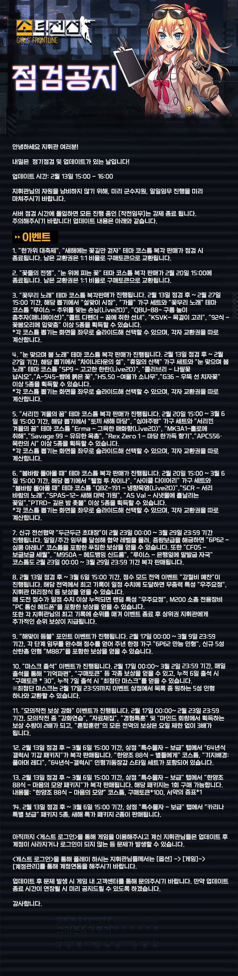 2월 13일 점검 및 업데이트 예고 – 소녀전선